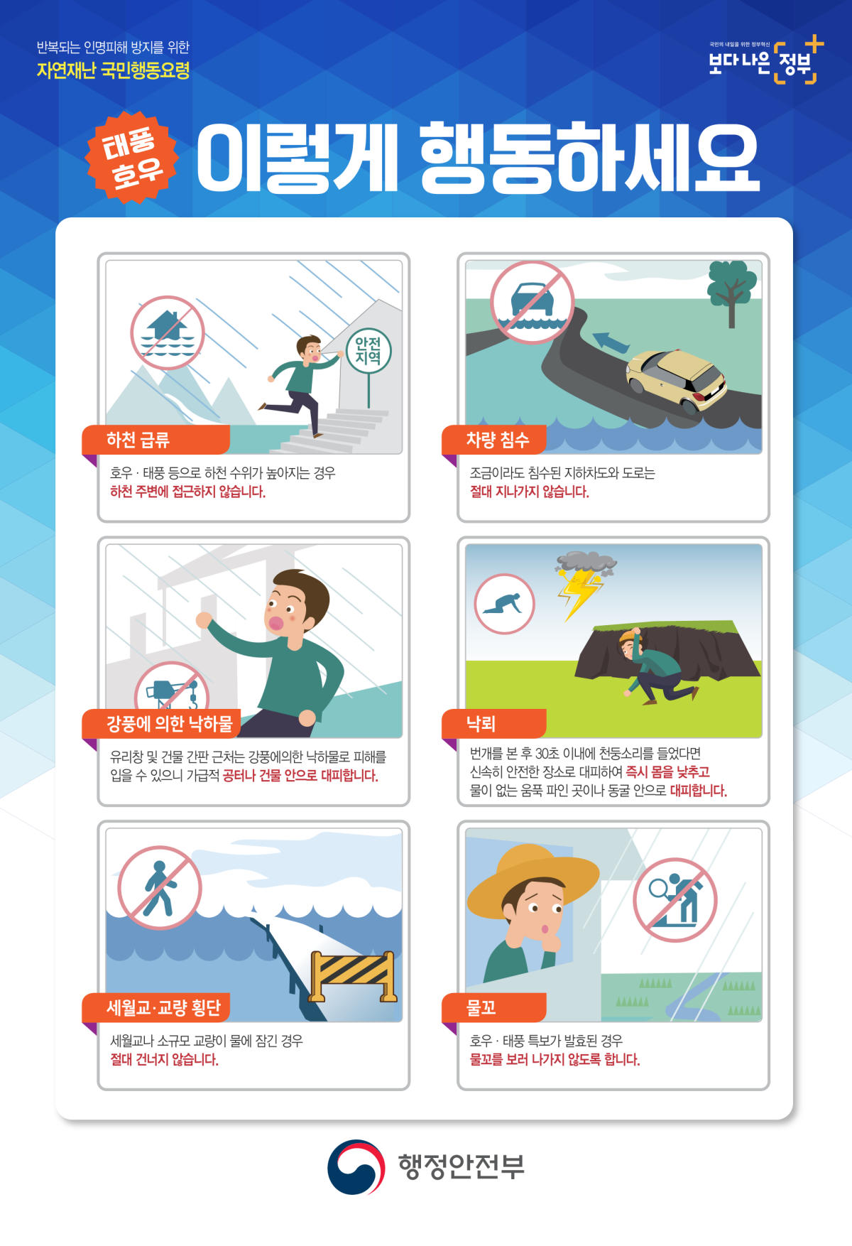 호우, 태풍, 침수 피해 예방 행동수칙을 확인하시고, 이번 여름엔 피해가 없도록 모두 함께 관심가져주세요~